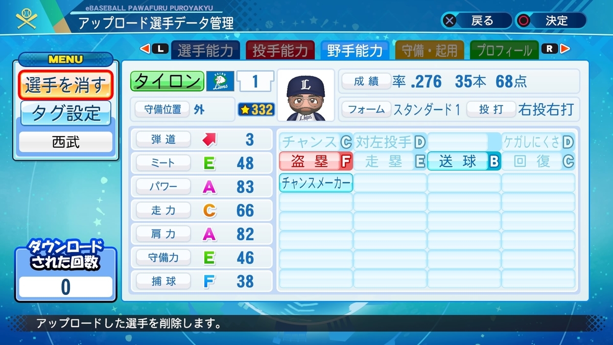 2020-08-26 ジム・タイロン(西武) OB選手 西武 助っ人外国人 1980 .276(529-146) 35本 68点 査定 チャンスメーカー 1番打者として起用され35本塁打 送球B 補殺12。翌年は20補殺。 レーザービームでもよいか 日本で4年間プレー。80年に35本塁打放つも、トレード。南海でも安定した打撃と強肩を発揮。ただ守備に不安があり、82年限りで退団。