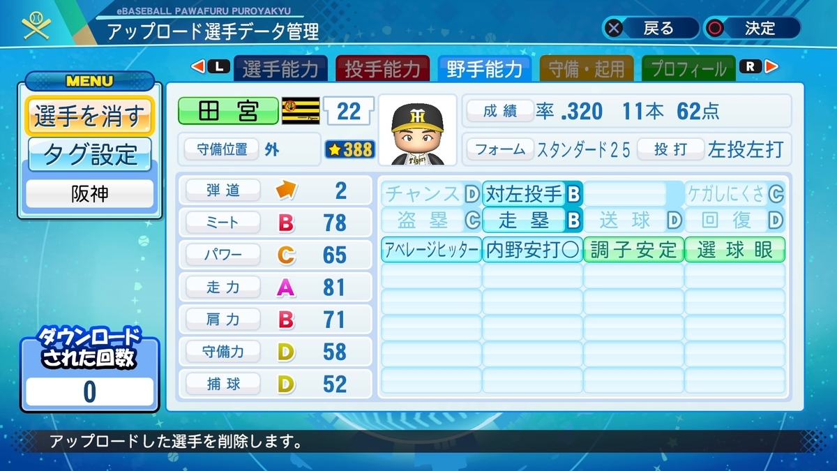 2020-11-27 田宮謙次郎(大阪)【パワプロ2020・パワナンバー】 OB選手 阪神 パワナンバー:12700 91044 09842 1958 .320(387-124) 11本 62点 査定 敬遠20もあったんですね。この年だけちょっと盗塁が少ないですね。