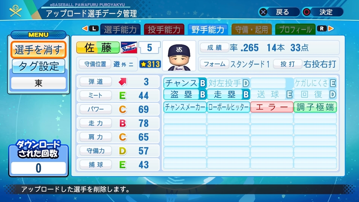 2021-07-09 佐藤孝夫(国鉄)【パワナンバー・パワプロ2021】 OB選手 ヤクルト パワナンバー:12700 41726 38891 1952 .265(321-85) 14本 33点 査定 チャンスB 得点圏打率リーグ2位 盗塁B (55-45) 走塁B 14試合連続得点など出塁に対して得点が多い 久しぶりの作成です。 良かったらお題箱にリクエストしていってね。